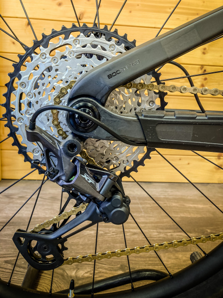 Řadící aparát je víceméně v sériovém osazení. Řazení a kazeta Shimano SLX, přehazovačka XT. Změn doznaly kliky, původní Shimano MT611 nahradily SLX. Tuningovými díly jsou vodítko české výroby Manobike a zlatý řetěz KMC.